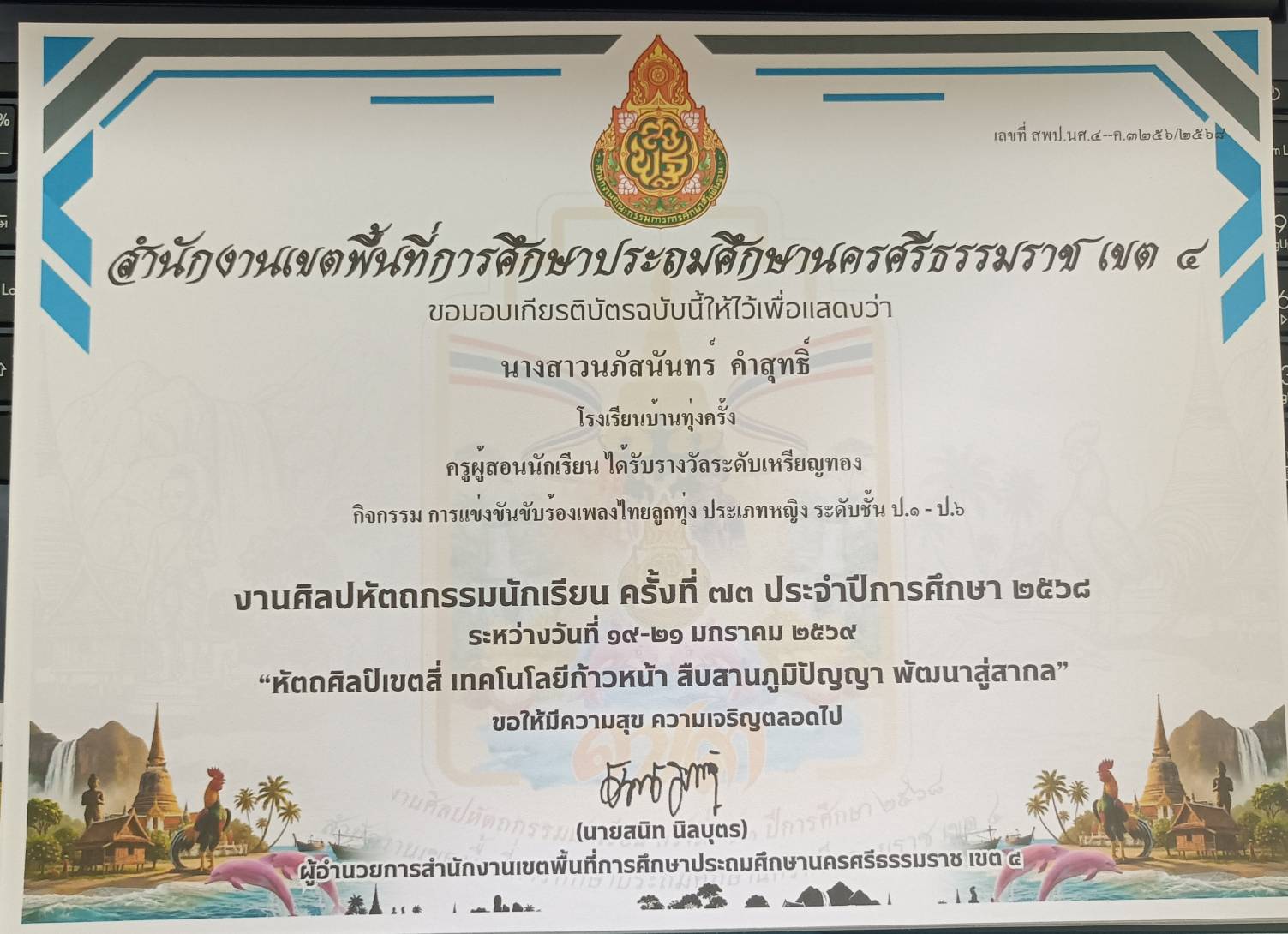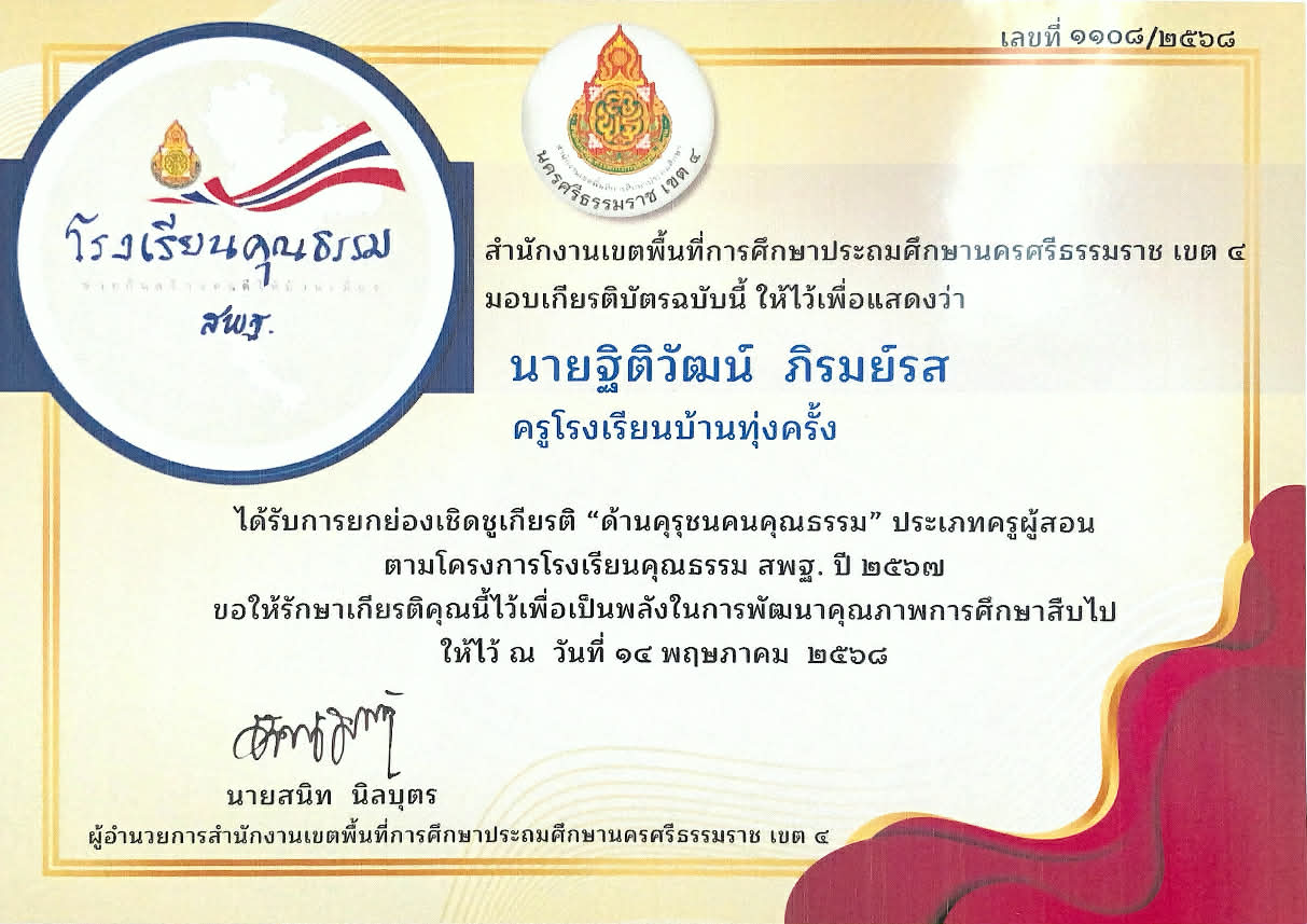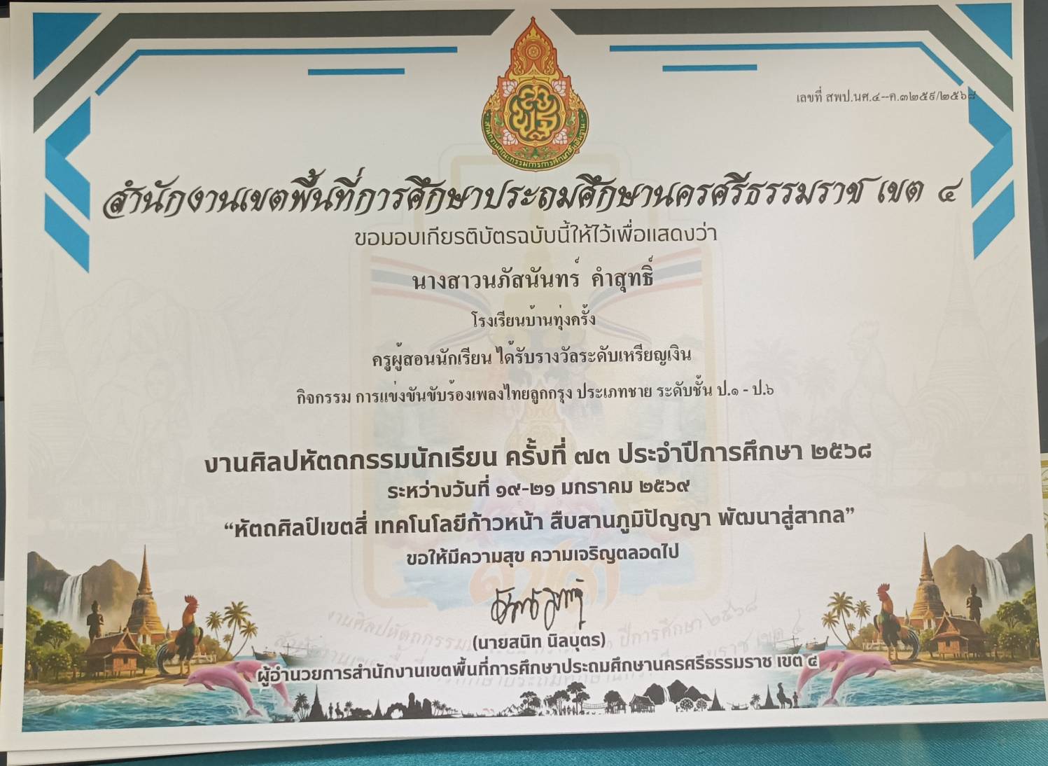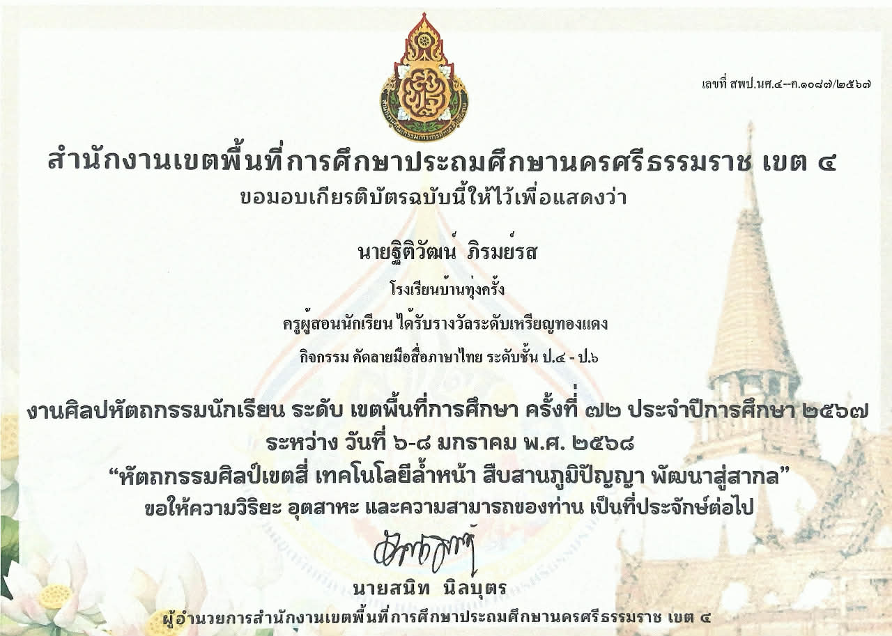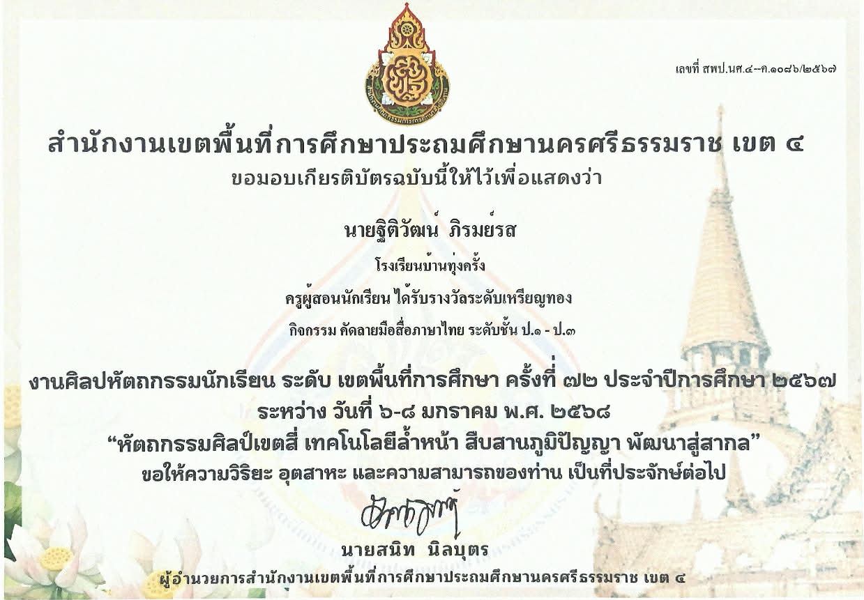 ครูผู้สอนนักเรียน ได้รับรางวัลระดับเหรัยญเงิน กิจกรรม การแข่งขันขับร้องเพลงไทยลูกทุ่งประเภทความพิการ บกพร่องทางการเรียนรู้ ระดับชั้น ป.๑ - ป.๖ ปีการศึกษา 2568 |