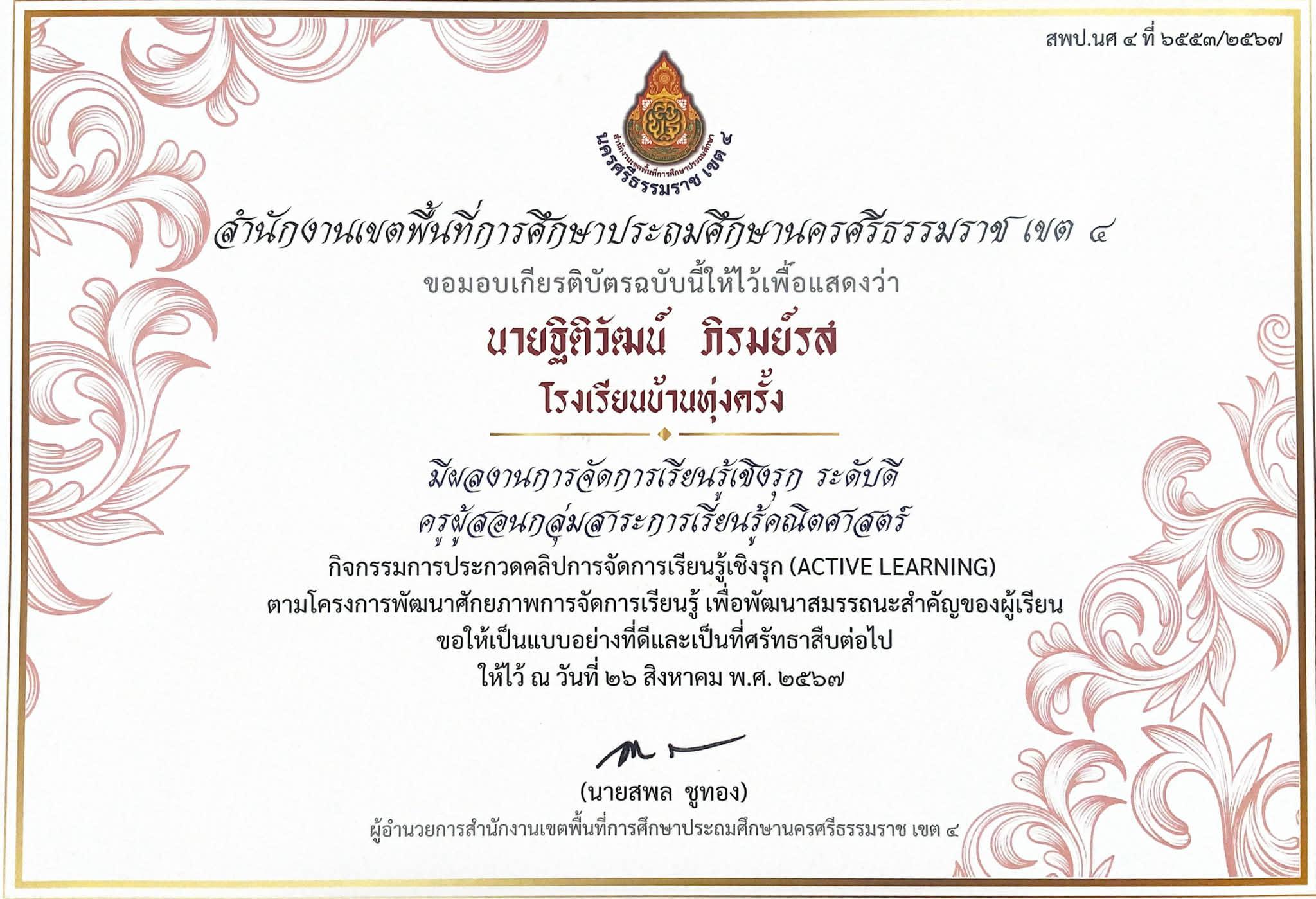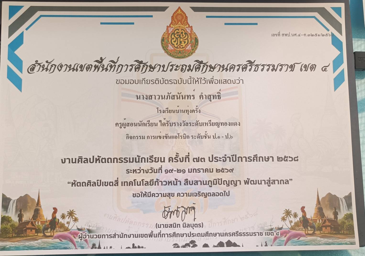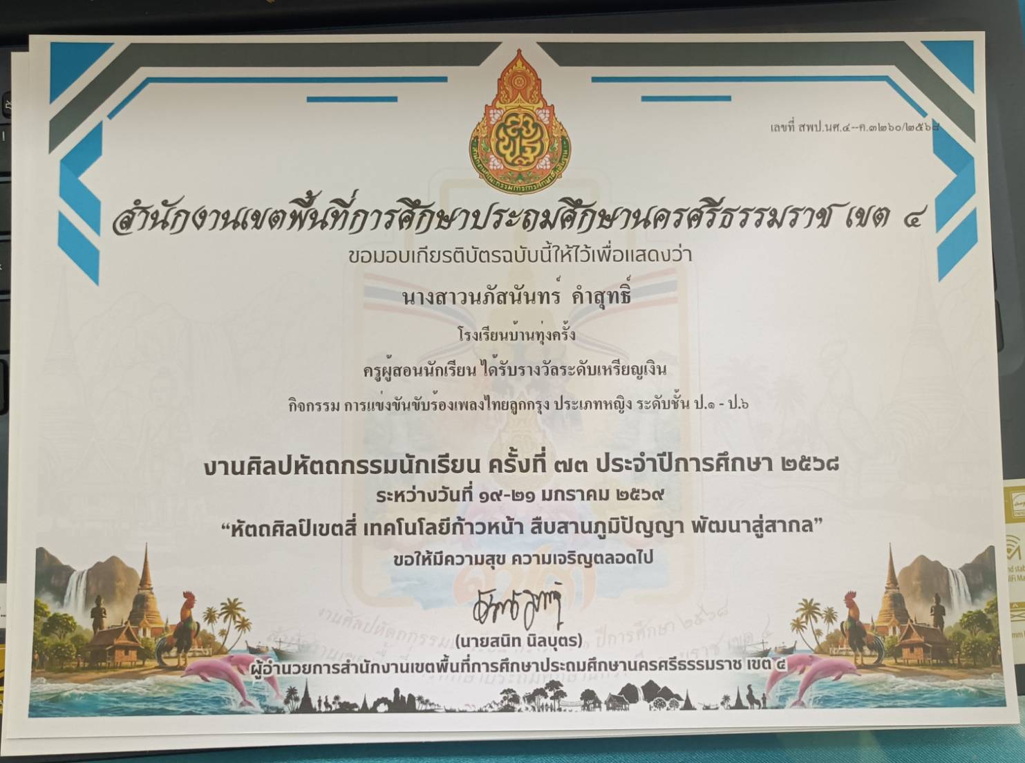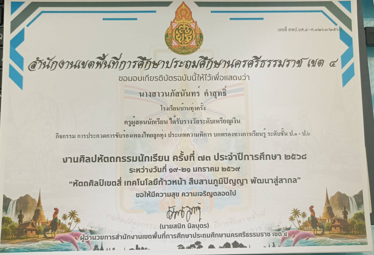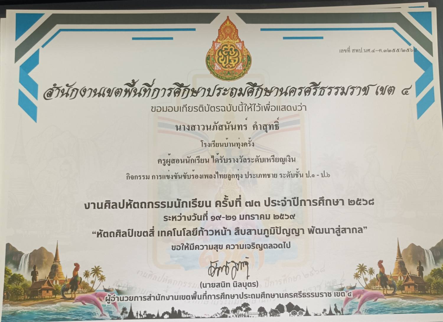ครูผู้สอนนักเรียน ได้รับรางวัลระดับเหรัยญเงิน กิจกรรม การแข่งขันขับร้องเพลงไทยลูกทุ่งประเภทความพิการ บกพร่องทางการเรียนรู้ ระดับชั้น ป.๑ - ป.๖ ปีการศึกษา 2568 |