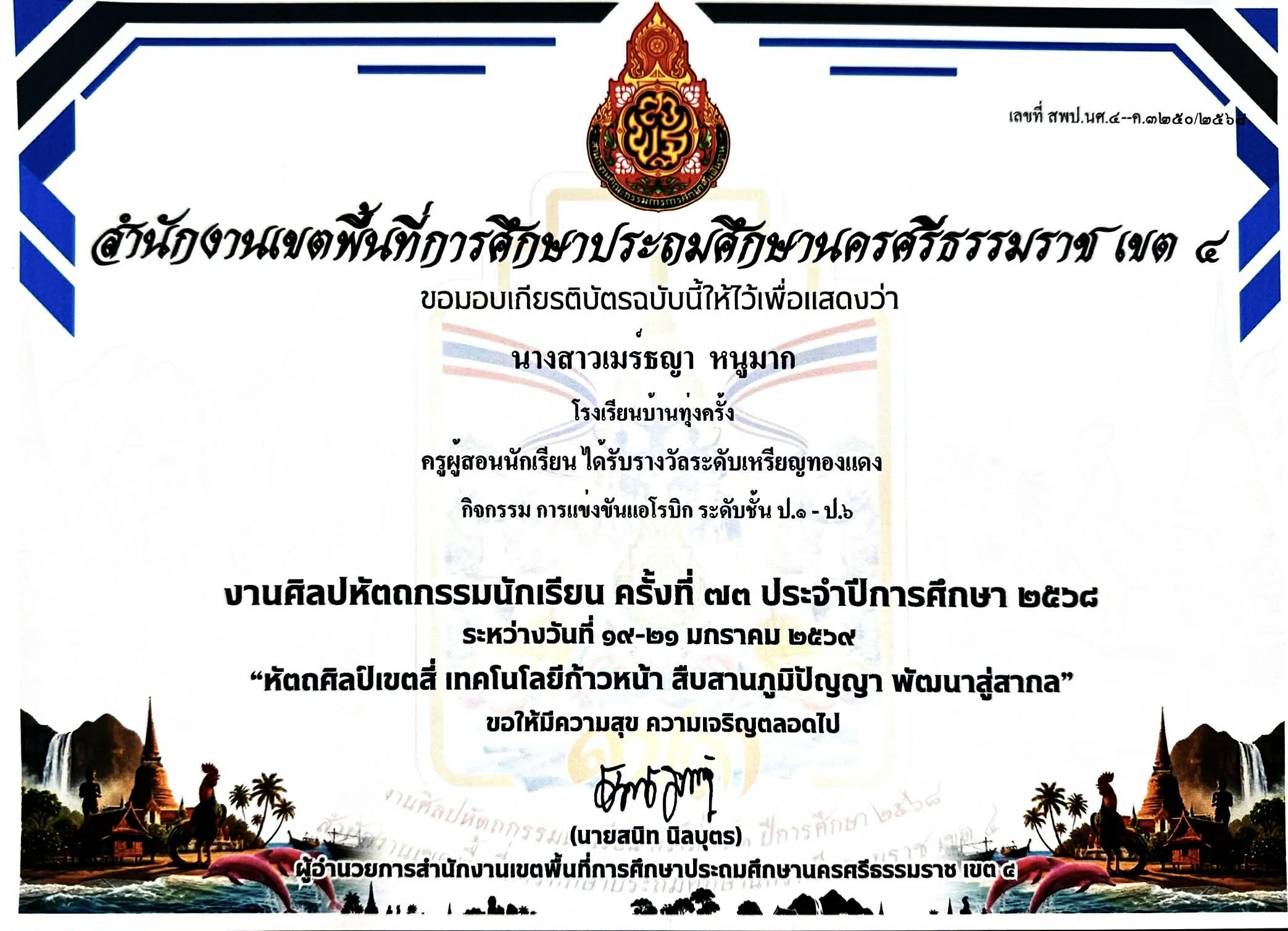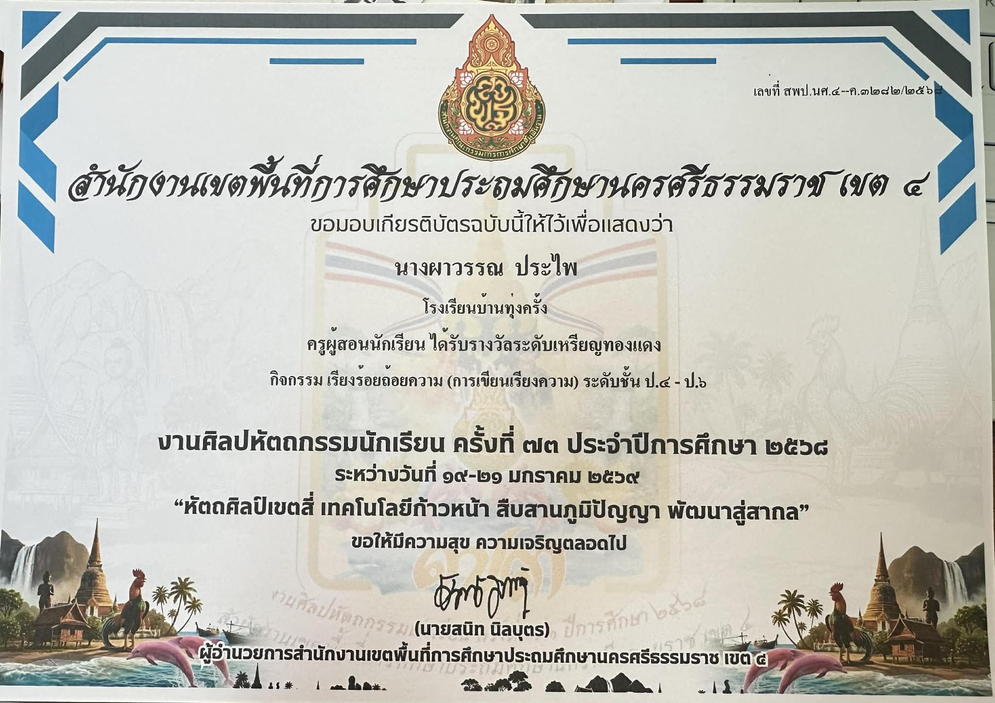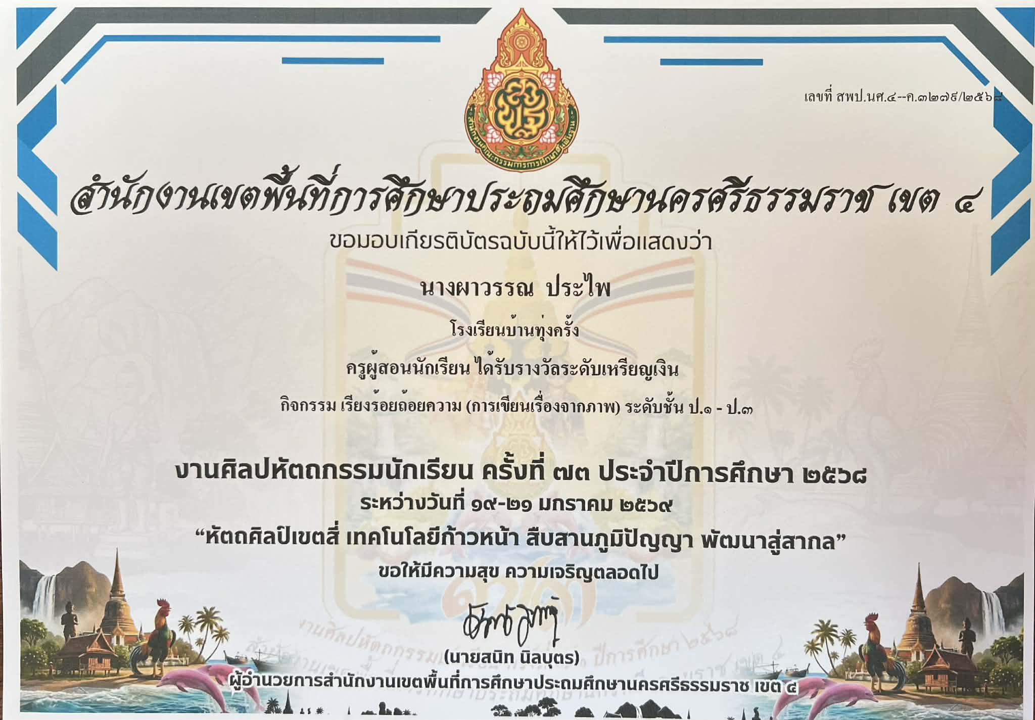 ครูผู้สอนนักเรียน ได้รับรางวัลระดับเหรัยญเงิน กิจกรรม การแข่งขันขับร้องเพลงไทยลูกกรุงชาย ระดับชั้น ป.๑ - ป.๖ ปีการศึกษา 2567 |