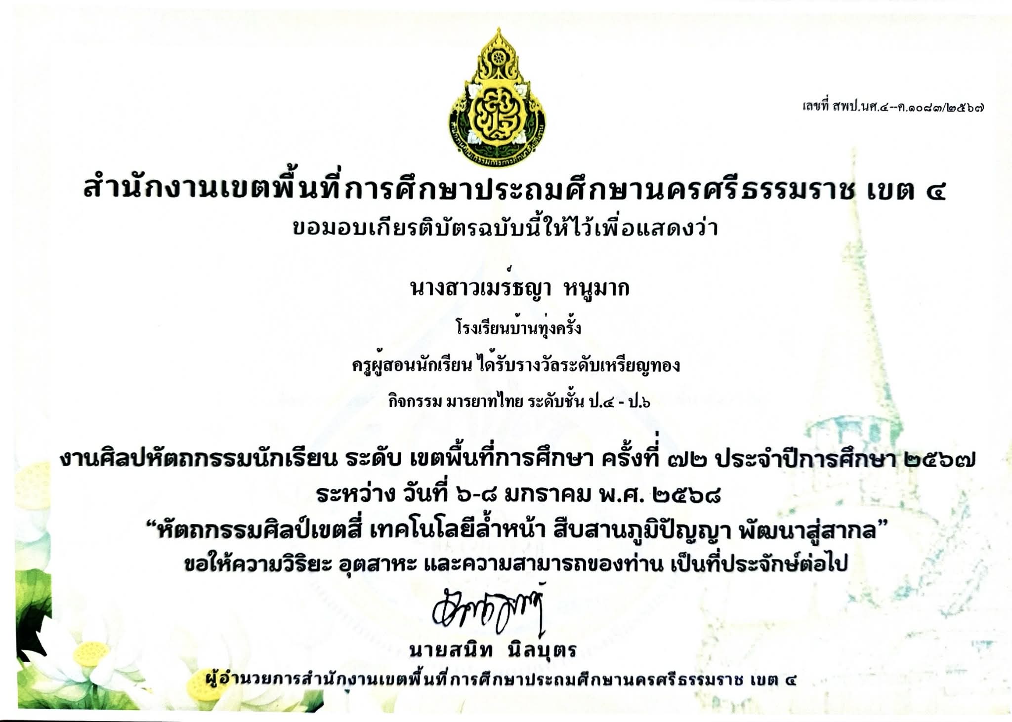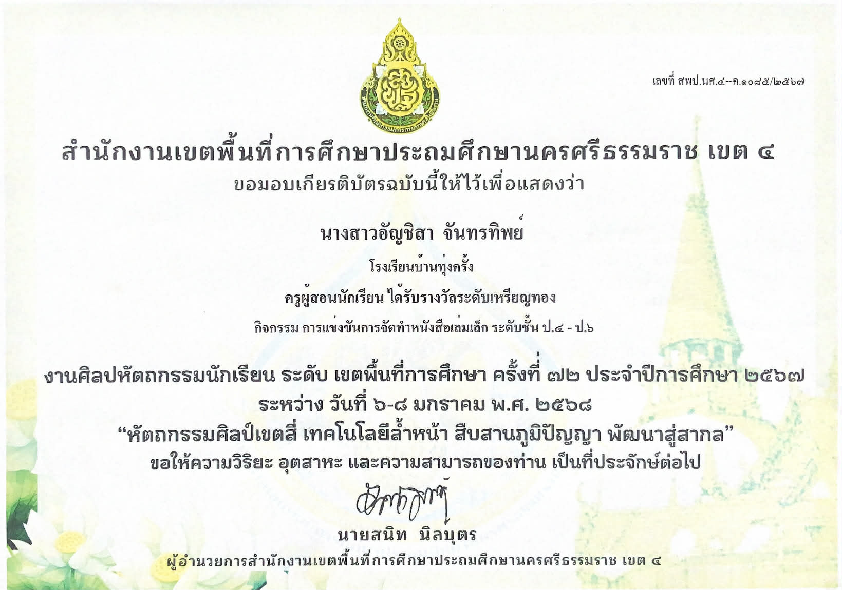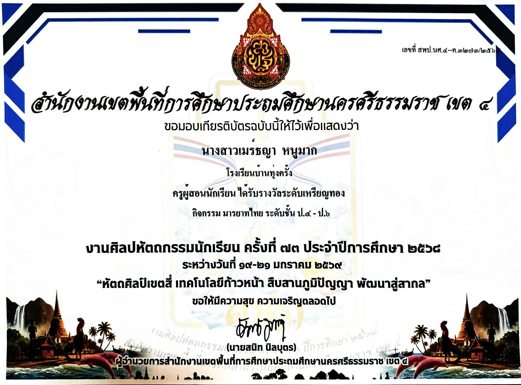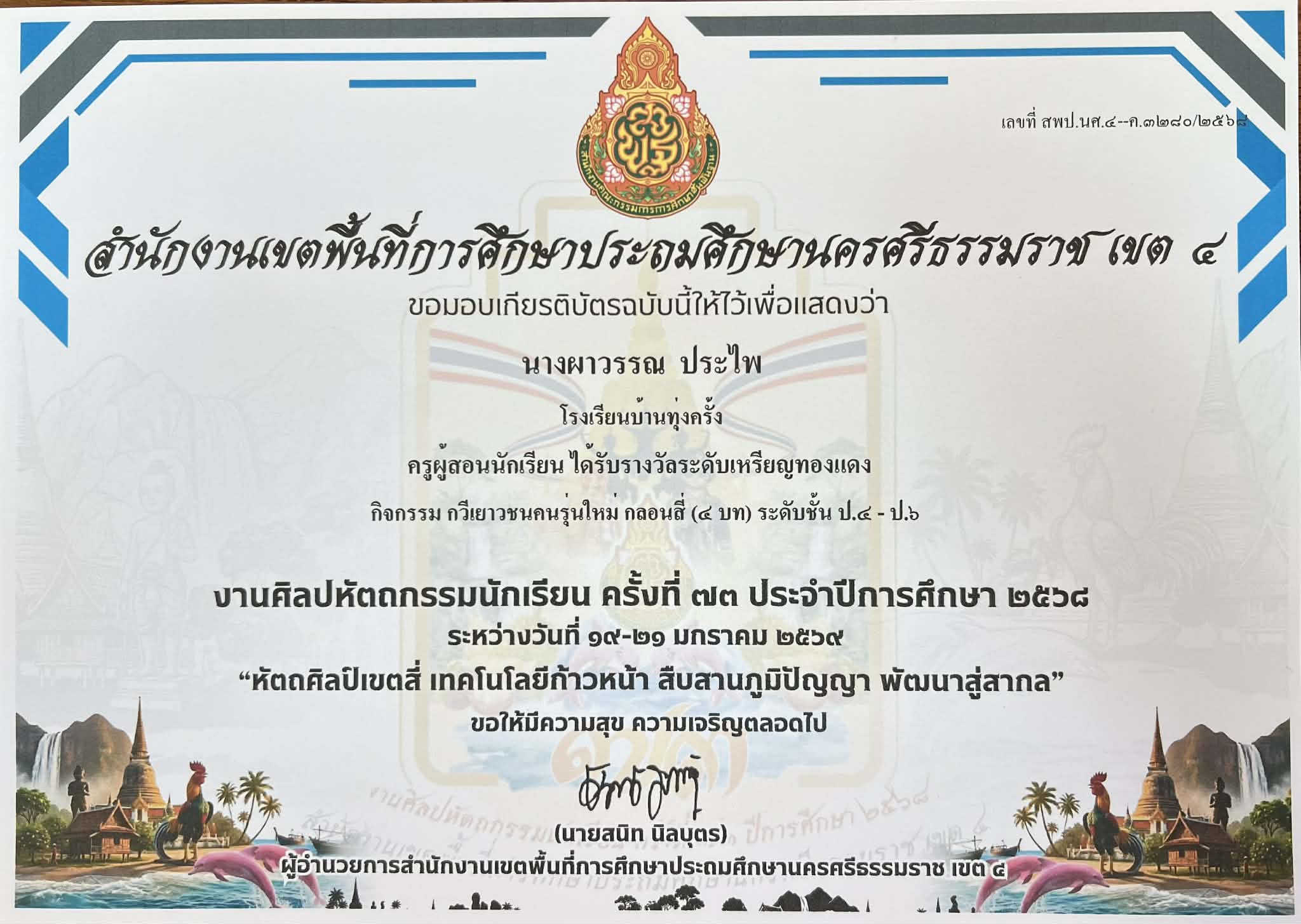 ครูผู้สอนนักเรียน ได้รับรางวัลระดับเหรัยญเงิน กิจกรรม การแข่งขันขับร้องเพลงไทยลูกกรุงชาย ระดับชั้น ป.๑ - ป.๖ ปีการศึกษา 2567 |